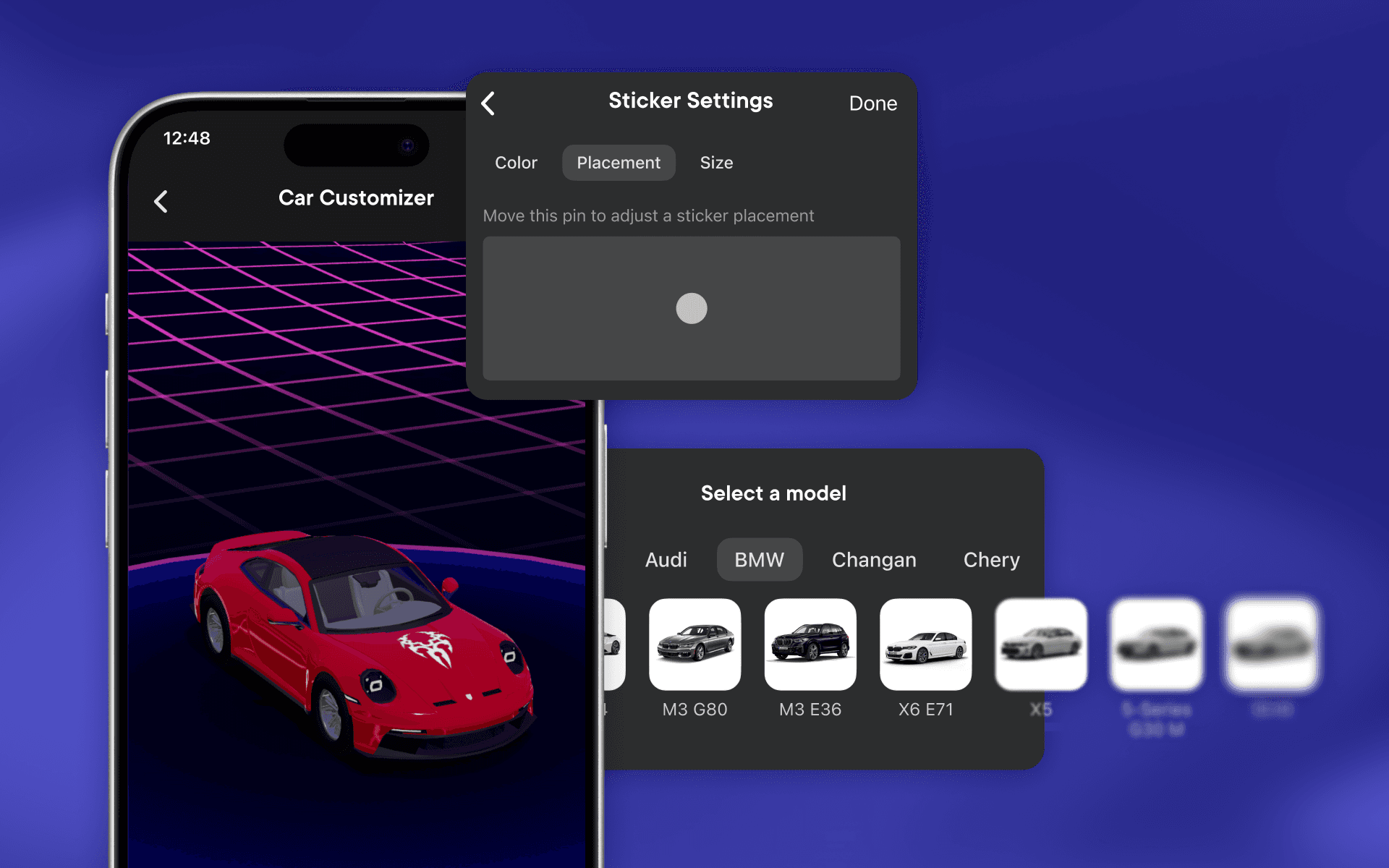 Мы обеспечили функционал для детальной кастомизации: изменение цветов, добавление обвесов, замена дисков и наклеек, тонировка окон и настройка обивки салона автомобиля.