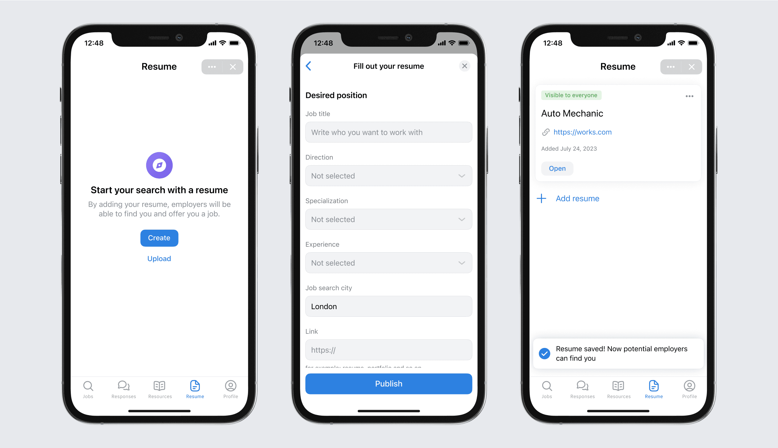 На первом этапе были реализованы ключевые функции: регистрация пользователей, создание и редактирование профилей, публикация резюме, базовый поиск вакансий, подача откликов на вакансии. Эти функции закрывают основные потребности пользователей и формируют основу для будущих доработок.
