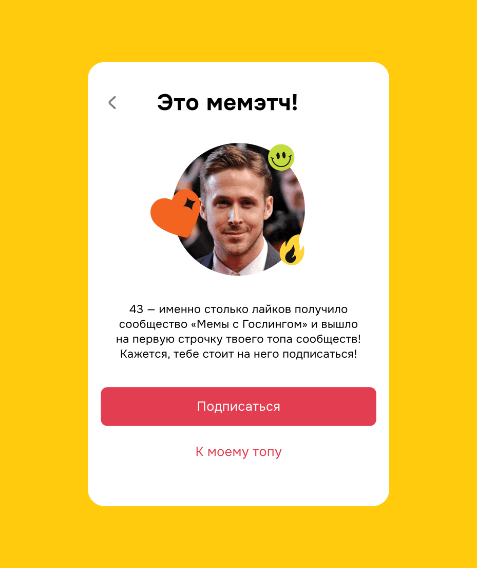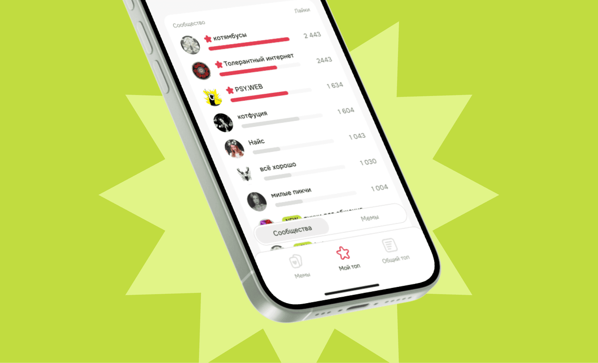 Тиндер в мире мемов. Пользователи смотрят и свайпают юмористический контент из реальных сообществ ВКонтакте и формируют рейтинг лучших пабликов.