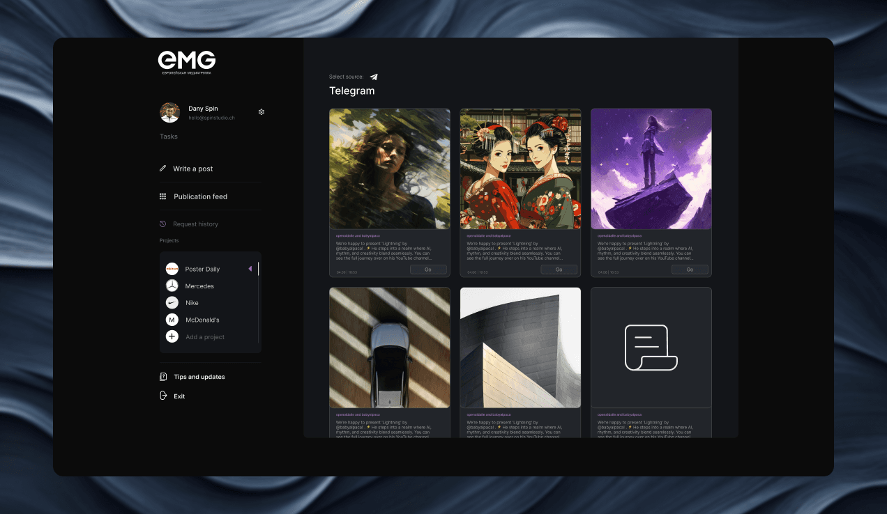 Создали удобный пользовательский интерфейс с рабочими пространствами, профилями пользователей и системой разграничения прав доступа для удобного управления задачами по созданию контента.