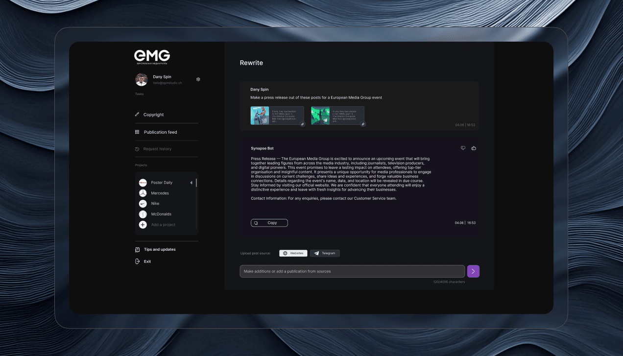 Инструмент на базе ChatGPT-4 для быстрой и эффективной генерации контента. Создан для упрощения работы пресс-секретарей, SMM-специалистов и копирайтеров.